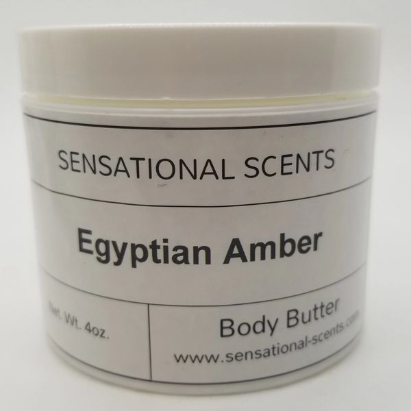 The Egyptian Amber scented shea body butters have a complex woody blend infused with five essential oils. This shea butter has a rich base of vanilla, dark musk, and sandalwood. Unisex scent.